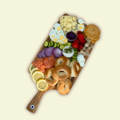 A luxe brunch spread with bagels, smoked salmon, eggs, cream cheese, veggies, and citrus — ideal for showers, parties, or Sunday treats.