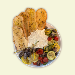 Whipped feta topped with roasted veggies and herbs, served with crostini.