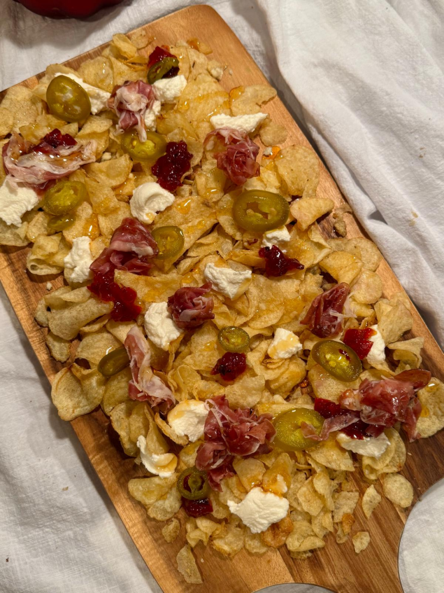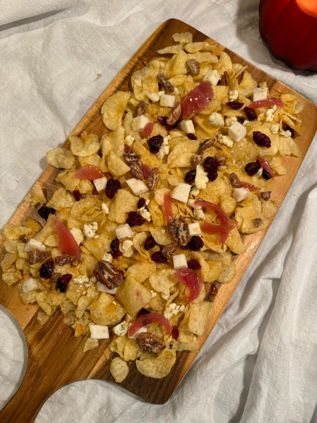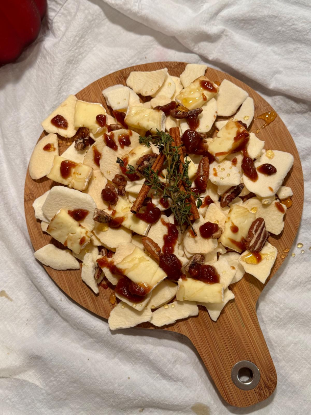 Apple chips, caramel pecan apple butter, candied pecans, and Brie, topped with honey drizzle