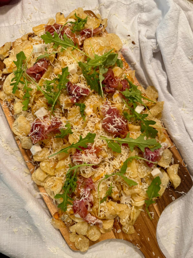 Truffle goat cheese, prosciutto, arugula, and Parmesan, topped with hot honey drizzle