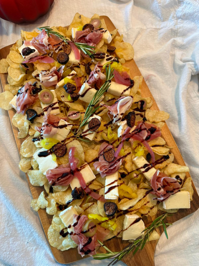 Prosciutto, Brie, sliced figs, banana peppers, green olives, and pickled onion, topped with balsamic glaze