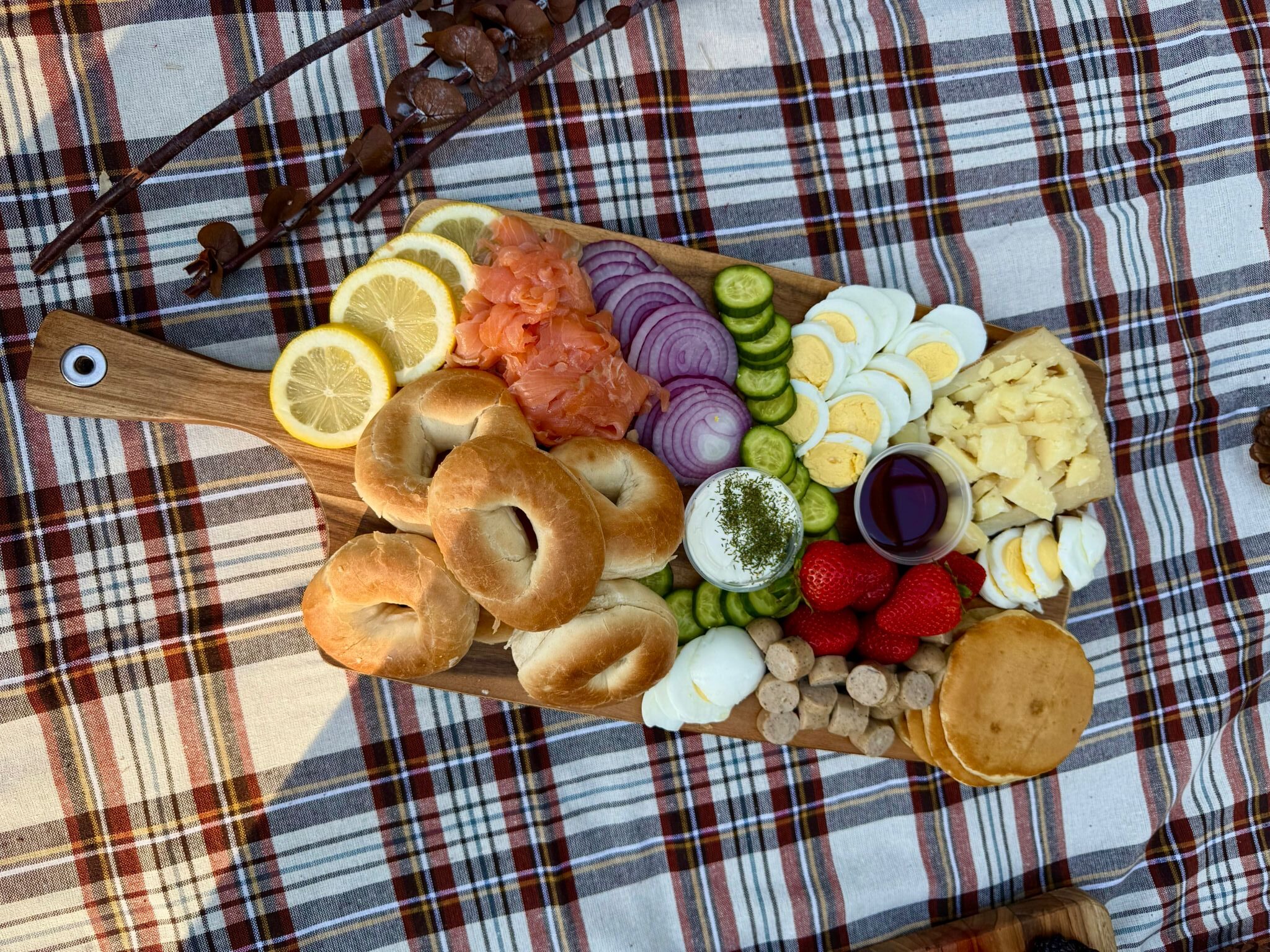 A luxe brunch spread with bagels, smoked salmon, eggs, cream cheese, veggies, and citrus — ideal for showers, parties, or Sunday treats.